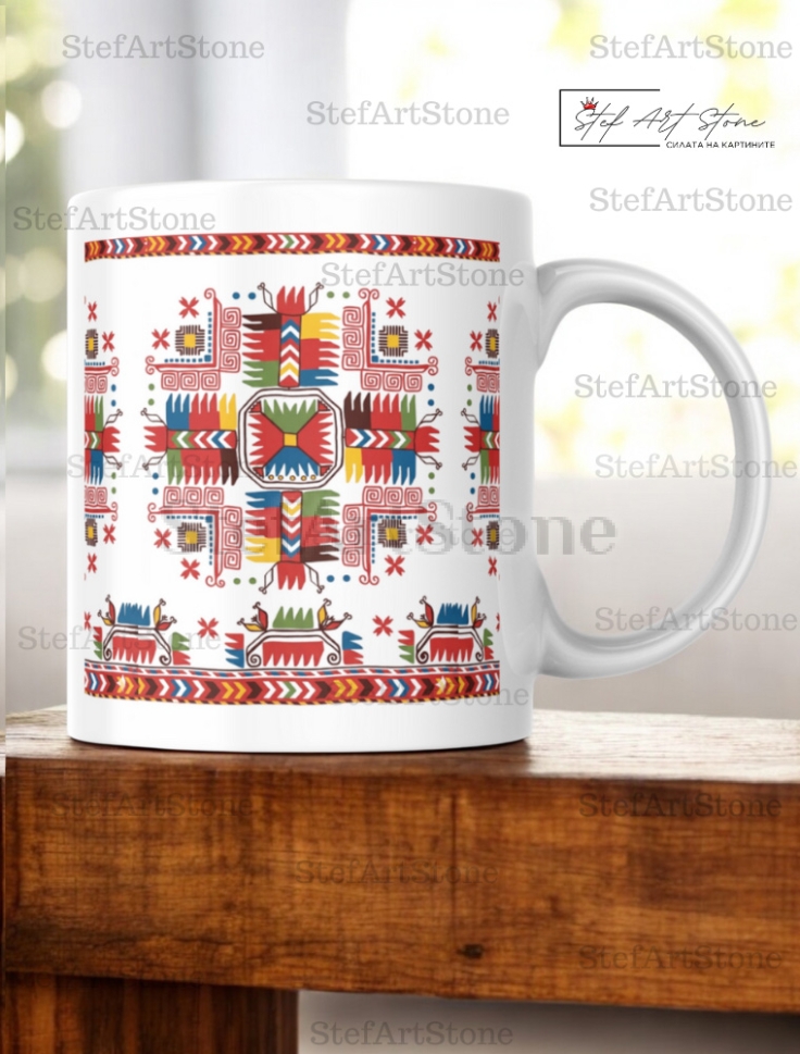 Днес този древен знак оживява върху висококачествена керамична чаша, създадена за хора, които търсят смислен етно подарък, а не масов продукт без история.