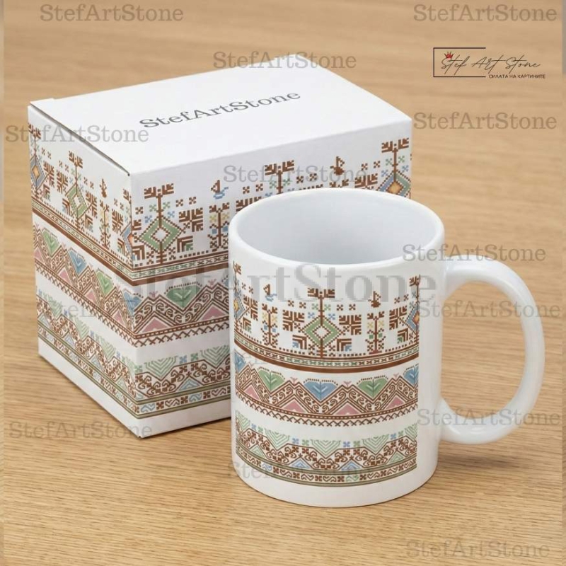 Всяка чаша от серия "Възраждане" пристига при вас в красива тематична кутия, която повтаря мотива на самата шевица. Не е нужно да мислите за допълнителна опаковка – получавате напълно завършен и стилен подарък, готов за връчване веднага!