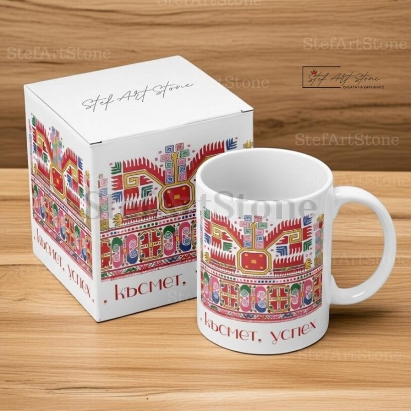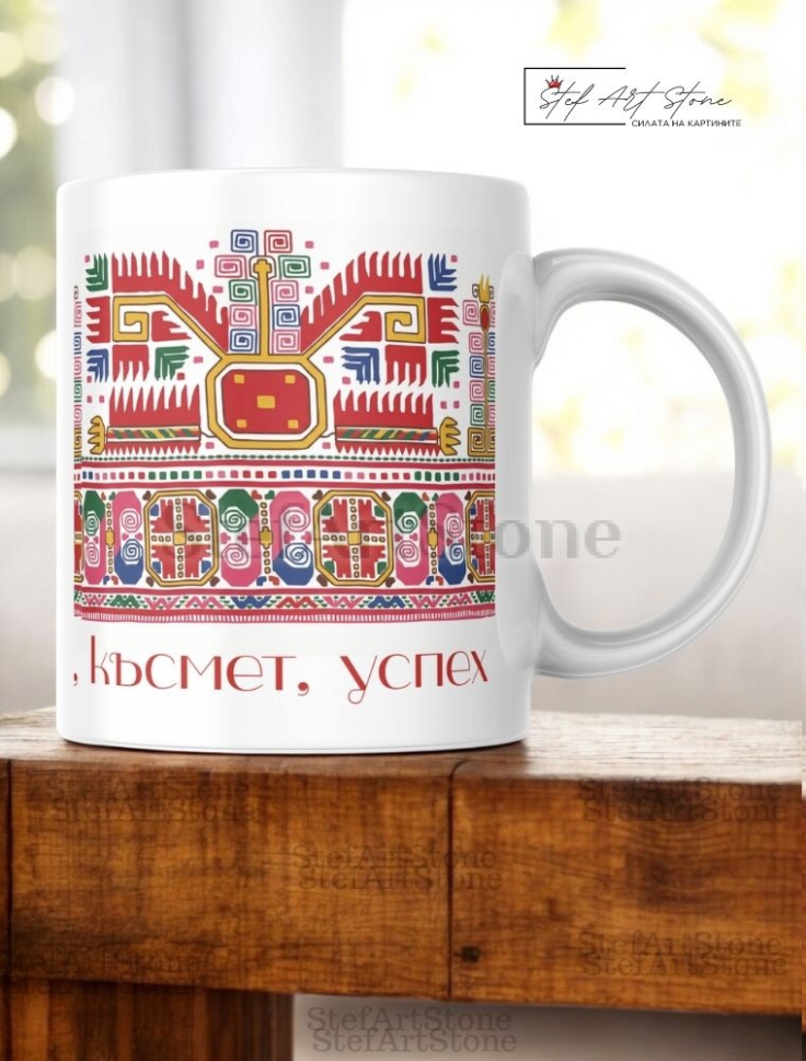 Тази керамична чаша с българска шевица съчетава силата на вековните традиции с модерно пожелание за просперитет. Моделът изобразява една от най-силните български автентични шевици – "Богинята Майка", стилизирана в ярки цветове, за да носи позитивна енергия.