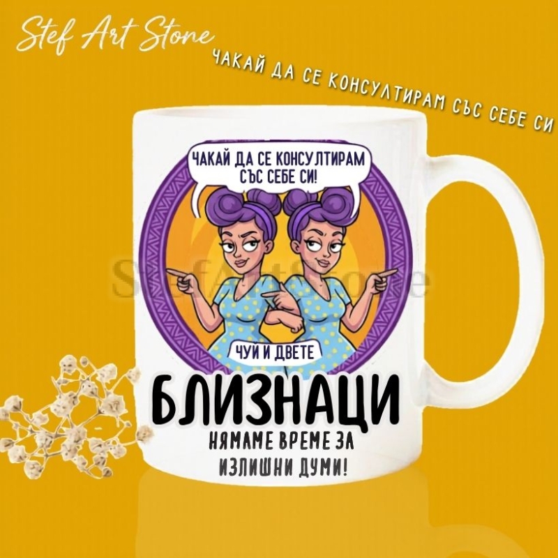 Тази красива чаша по поръчка представя забавна илюстрация на две момичета, които обсъждат нещо помежду си, символизирайки двойствената природа на знака. Композицията е завършена от гениалните реплики: ЧАКАЙ ДА СЕ КОНСУЛТИРАМ СЪС СЕБЕ СИ!, призива ЧУЙ И ДВЕТЕ и категоричното БЛИЗНАЦИ - НЯМАМЕ ВРЕМЕ ЗА ИЗЛИШНИ ДУМИ! Това превръща артикула в идеалната чаша за рожден ден за всяка дама, която е душата на компанията, мисли бързо и винаги има какво да каже.