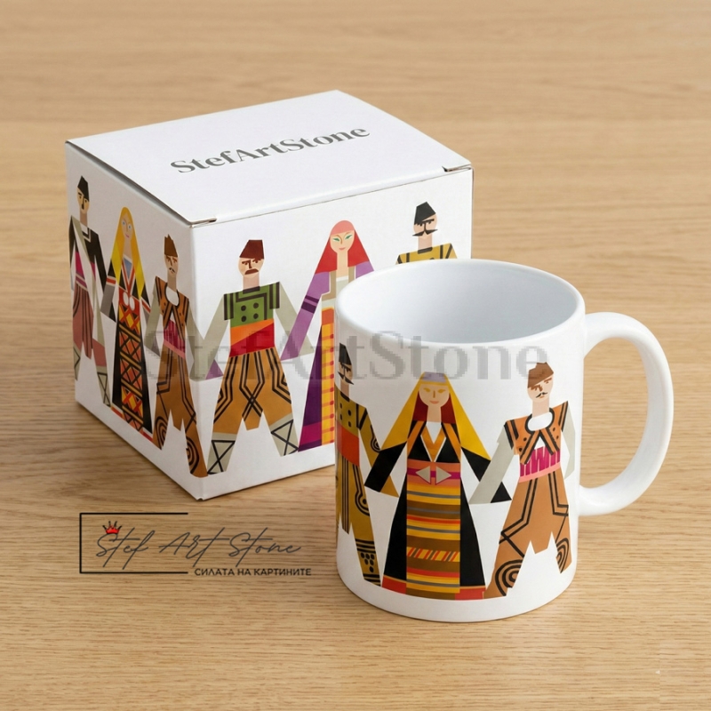 Търсите подаръци чаши? Предлагаме ви уникален модел с български мотиви – пъстро хоро в ярки цветове. Перфектно допълнение към колекцията от чаши с надписи за здраве. Пристига в кутия, готова за подаряване.