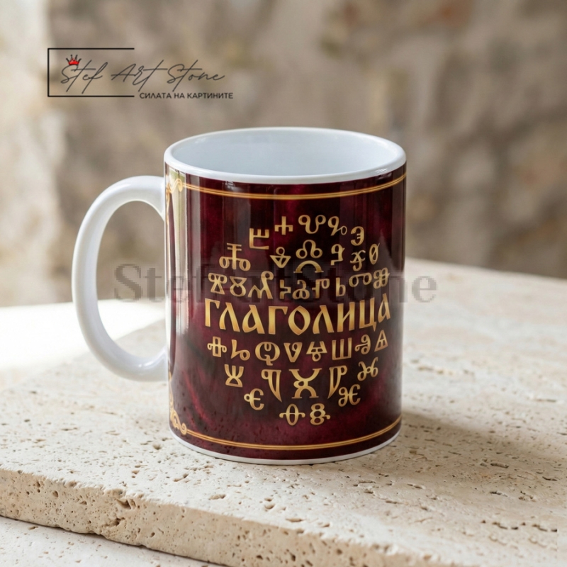- Кръгова Композиция: В центъра на чашата буквите от глаголицата са подредени в красив кръг (като слънце), а в средата е изписано името на азбуката.