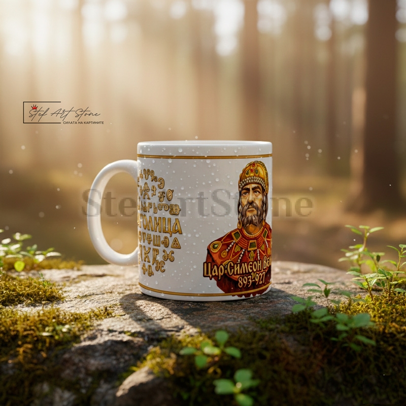 Специален модел бяла чаша, посветен на Златния век. Изобразява Цар Симеон Велики и кръгова композиция на Глаголицата. Символ на българската просвета и държавност. Най-добрият подарък за учители и будители