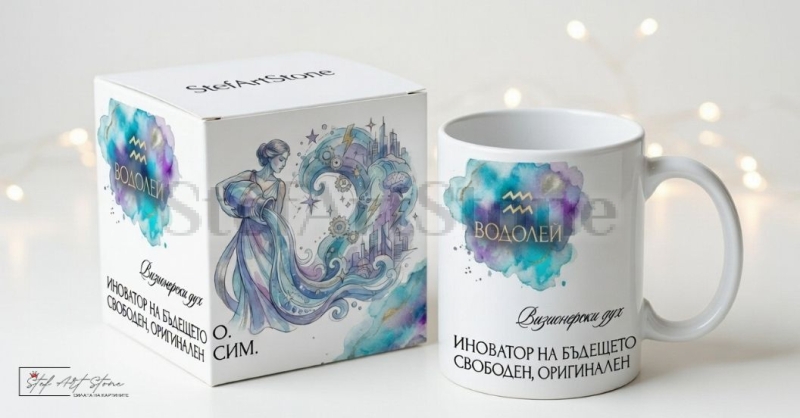 Чаша за Подарък за Рожден Ден – Зодия Водолей (Акварелни Мотиви с Кутия)