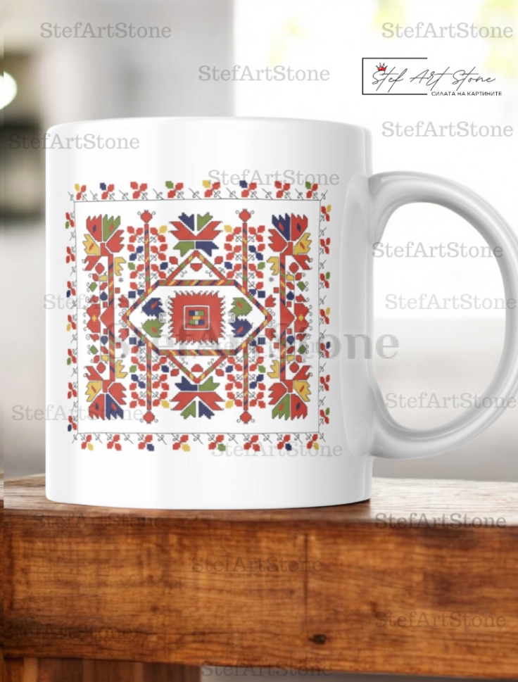 Тази керамична чаша с българска шевица е пример за гениалността на народните майстори да създават красота чрез ред и симетрия. Моделът представлява събирателен образ на български автентични шевици, подредени в строга, но празнична квадратна композиция.
