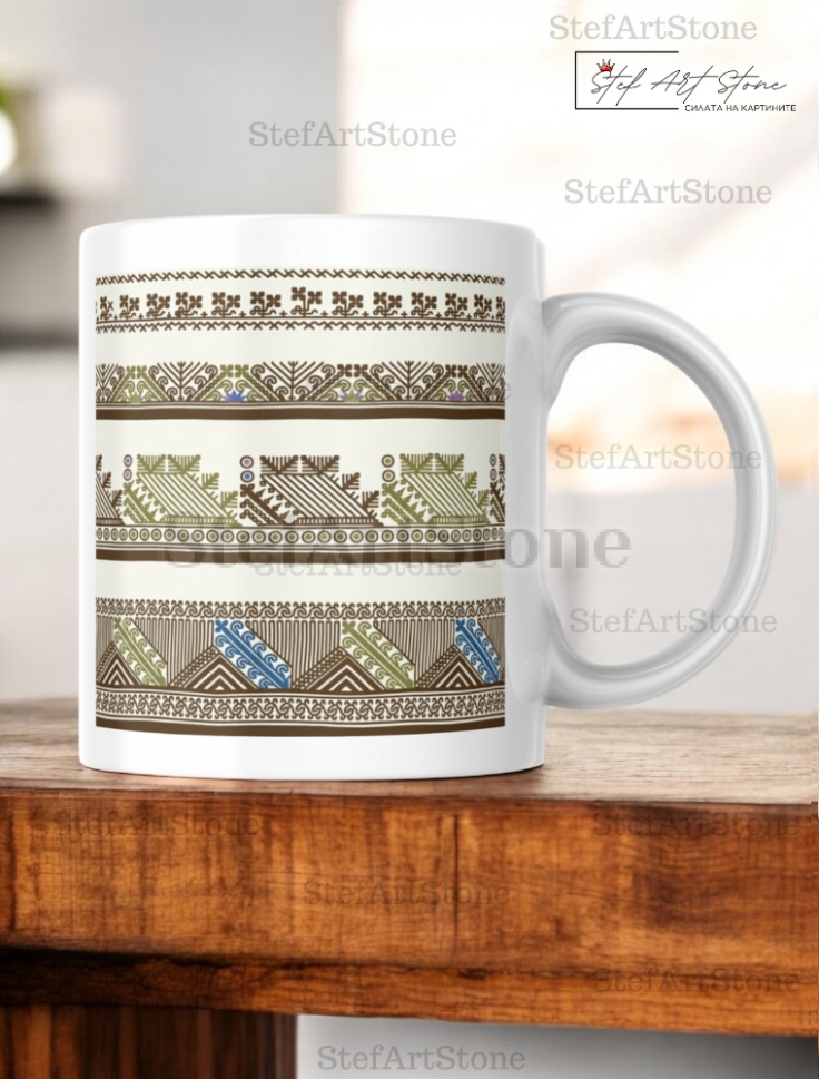 - Натурална палитра: За разлика от ярките празнични цветове, тук виждаме "тихите" тонове на българското село – маслинено зелено, орехово кафяво и бежово. Това прави чашата изключително стилна и ненатрапчива.