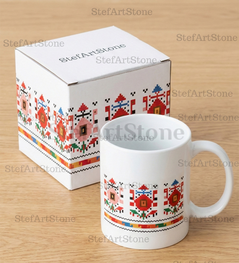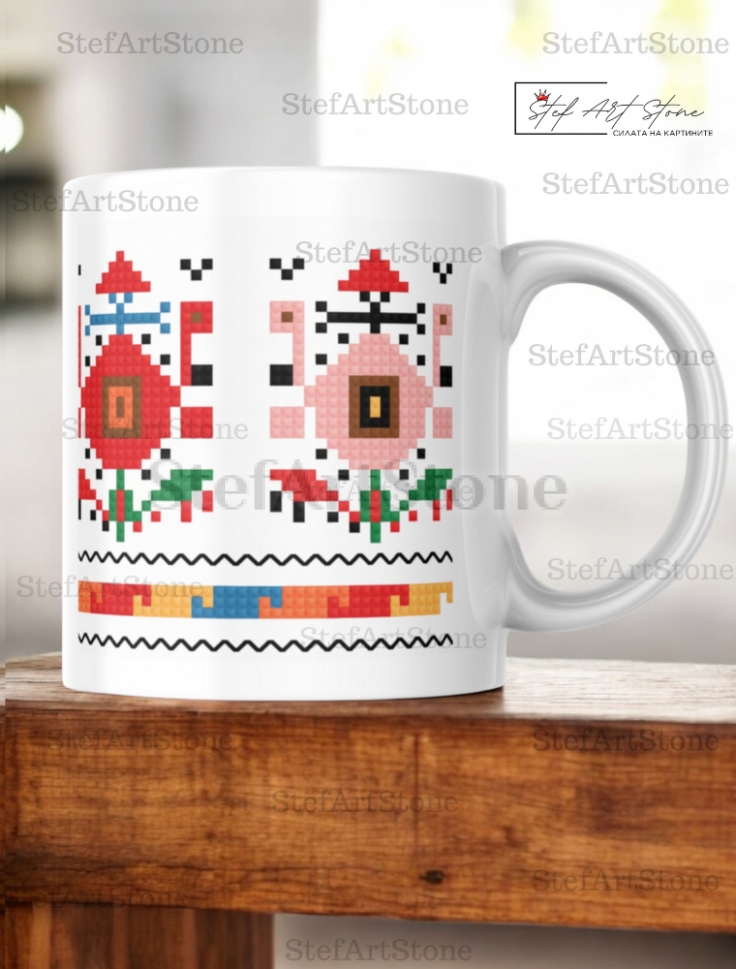 - Традиция в модерен прочит: Структурата тип "кръстат бод" стои автентично, но изчистеният бял фон придава на чашата съвременен вид, който пасва на всеки интериор.