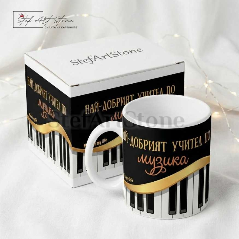 Дизайнът е създаден специално за хора на изкуството – класическа комбинация от черно, клавиши на пиано и изящна златна лента. Централно място заема посланието, което ще докосне сърцето на всеки педагог: "НАЙ-ДОБРИЯТ УЧИТЕЛ ПО музика". Нашите чаши за подарък са не просто красиви, но и практични, превръщайки се във верен спътник в междучасията или по време на дълги репетиции.