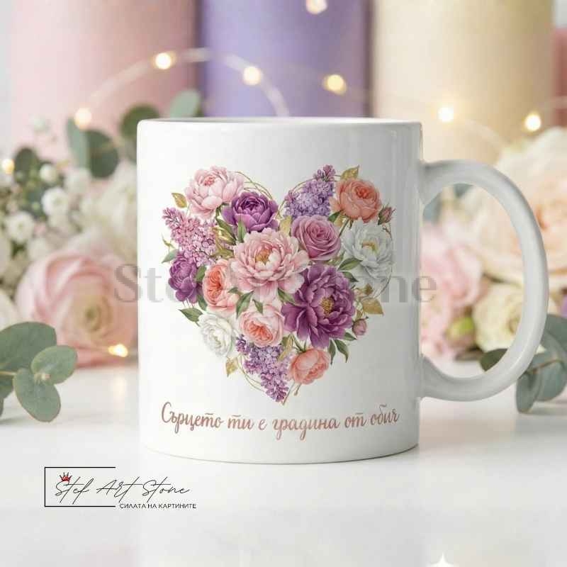 • Поетично Послание: Текстът "Сърцето ти е градина от обич" е написан с красив, ръкописен шрифт. Това е комплимент, който всяка жена би искала да чуе сутрин с кафето си.