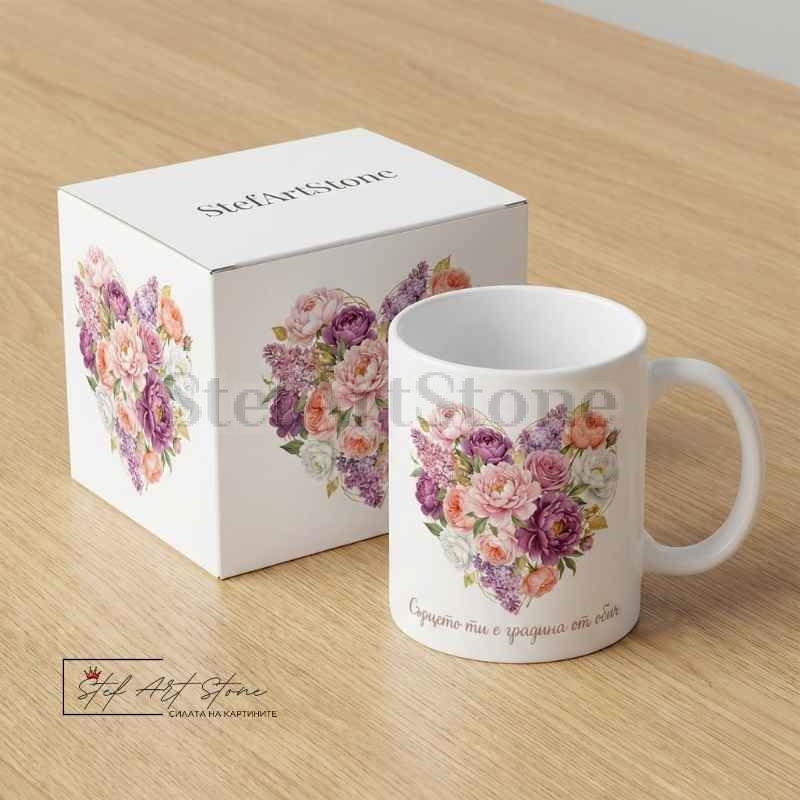 Висококачествена бяла керамична чаша (330 мл) с послание, което докосва душата. Дизайнът изобразява сърце, изплетено от божури и люляк, с калиграфски надпис "Сърцето ти е градина от обич".