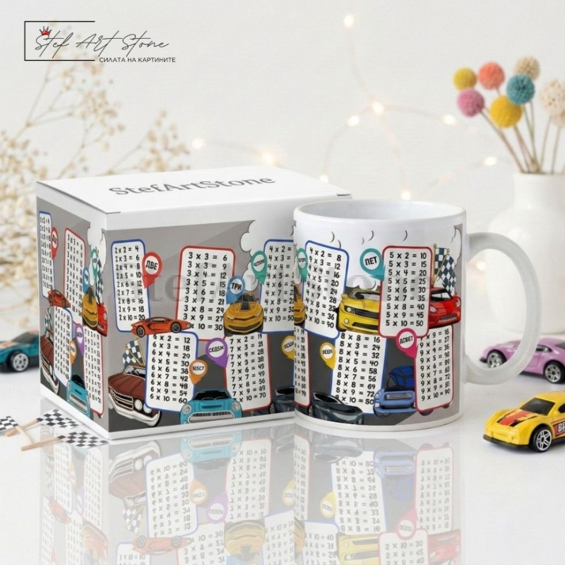 Детска Чаша с Таблица за Умножение и Мотиви Коли | Подарък за Ученик