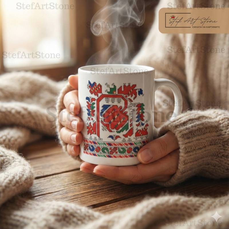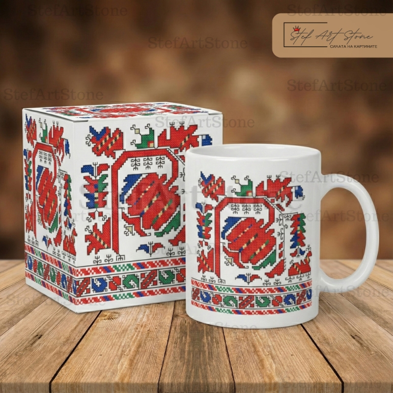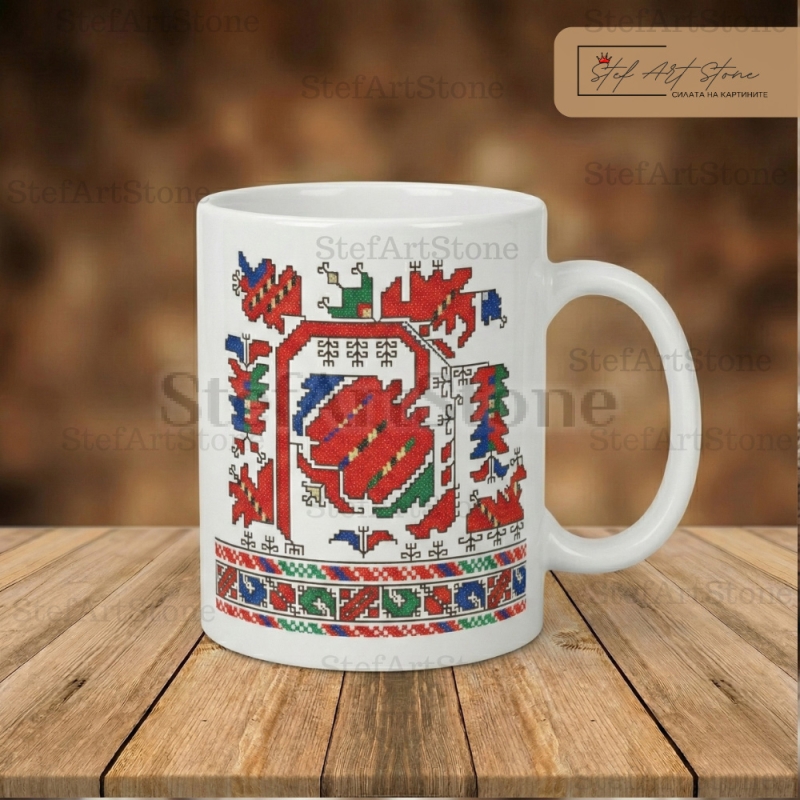 - ☕ Клас ААА+: Премиум бяла керамика, която подчертава контраста на шопската бродерия.