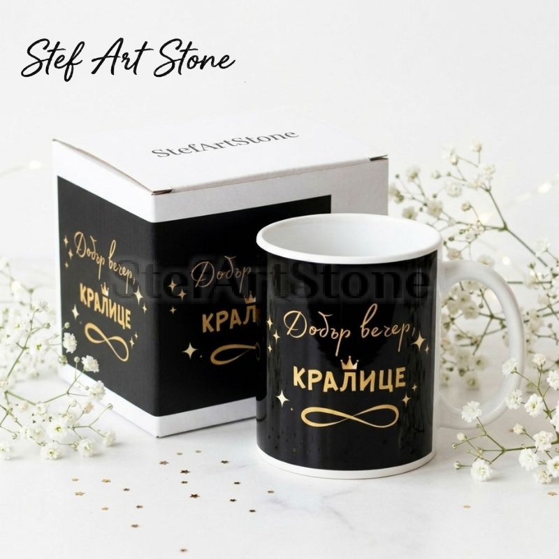 • Тип продукт: Висококачествена керамична чаша с елегантен дизайн. • Вместимост: Стандартна 330 мл. • Материал: Бяла керамика отвътре, плътен черен печат отвън със златни акценти. • Дизайн: Стилен черен фон, златна корона, звезди и надпис "Добър вечер, Кралице". • Опаковка: Включена тематична подаръчна кутия в черно и златно.