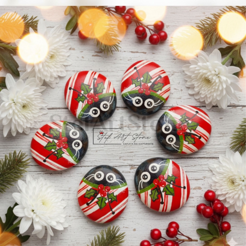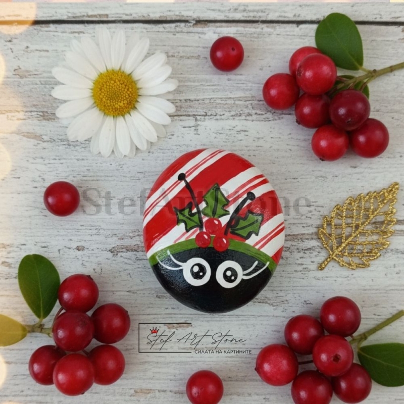 Този Ръчно Рисуван Камък с мотив на Коледна Калинка/Бръмбар е истински шедьовър на малката форма.