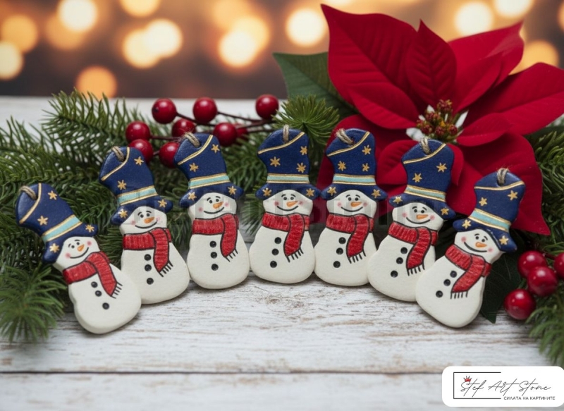 - $100\% Ръчна Изработка: Всяка КОЛЕДНА ИГРАЧКА Снежен Човек е уникална – моделирана и рисувана индивидуално. Това е премиум продукт, който гарантира неповторимост на Вашата украса.