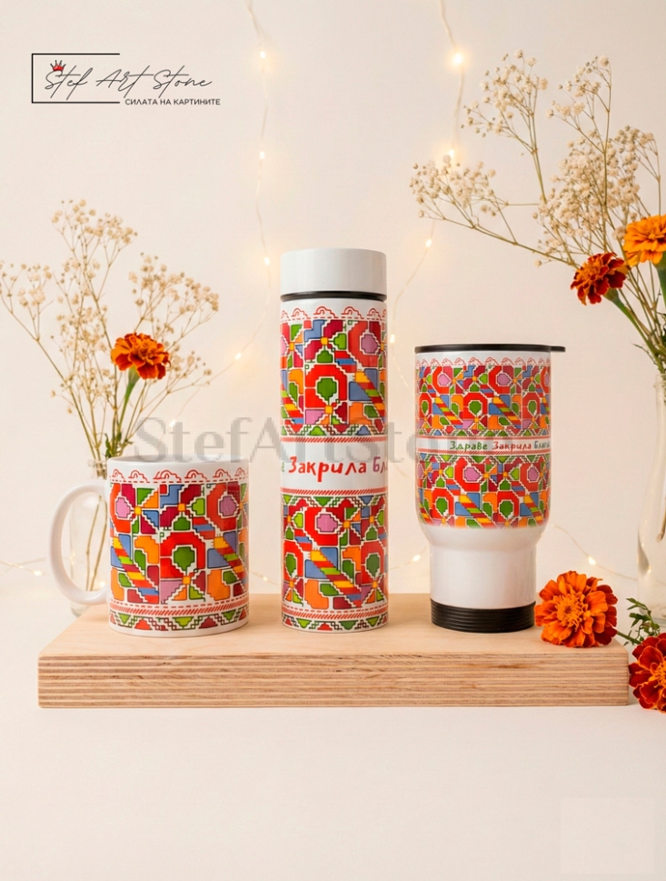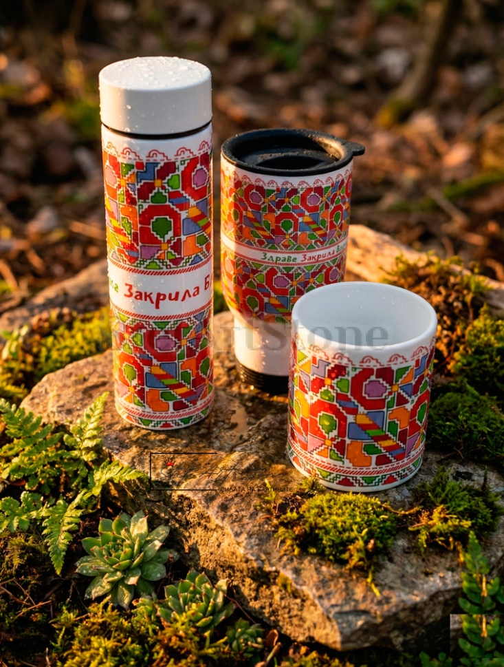 Пълен подаръчен комплект от 3 части: Термос с цедка (500 мл), Термо чаша за кола (500 мл) и класическа Керамична чаша. Всички продукти са с ярък дизайн на българска шевица и послание за "Здраве, Закрила и Благоденствие". Практичен и стилен избор за всекидневието или за подарък на чужденци.