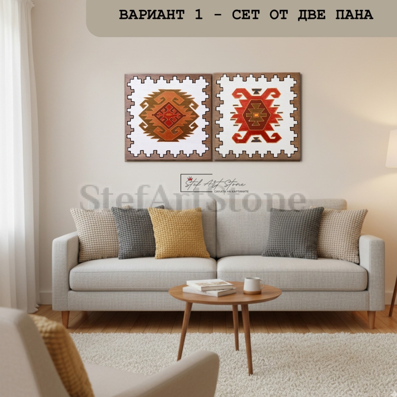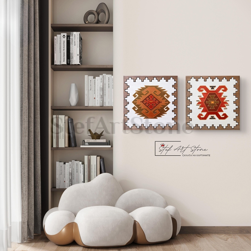 Този диптих е създаден специално за сърцето на дома – дневната или спалнята. Това не е просто декорация, а енергийна защита в две части, издържана в топлите цветове на земята и огъня.