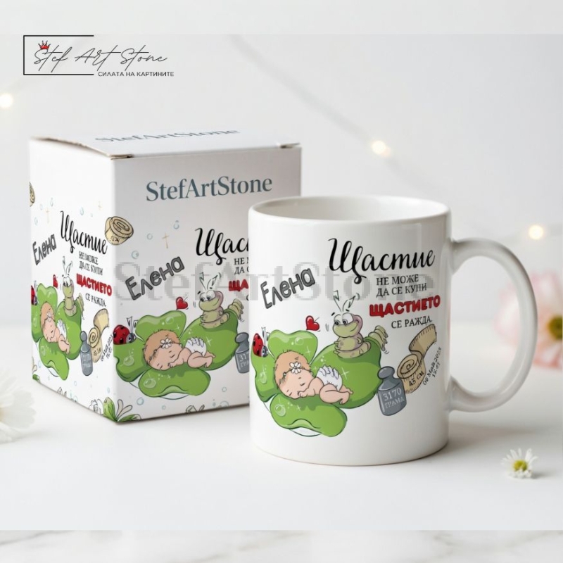 Дизайнът носи силно послание и символика. Върху чашата са изобразени прекрасни мотиви със спящо бебенце върху четирилистна детелина (вечният символ на късмета) и дълбокото послание: "Щастие не може да се купи. ЩАСТИЕТО се ражда.". Истинската стойност обаче идва с персонализацията – ние ще вградим личните данни на детето директно в илюстрацията. Теглото се изписва върху класическа тежест, а ръстът, датата и часът – върху навит шивашки метър. Заедно с името на детето, този жест става напълно уникален.