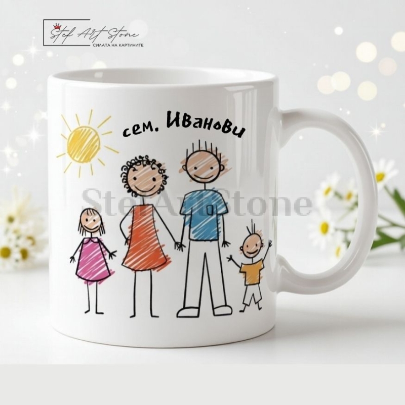 Нашите персонализирани чаши са създадени, за да пазят най-хубавите спомени. Най-голямото предимство на този модел е възможността да бъде изработен изцяло за вас – като чаша по поръчка, върху която ще отпечатаме конкретно фамилно име (напр. "сем. ИВАНОВИ"). Дизайнът е изключително мил, наподобяващ детска рисунка на щастливо семейство, хванато за ръце под ярко слънце.