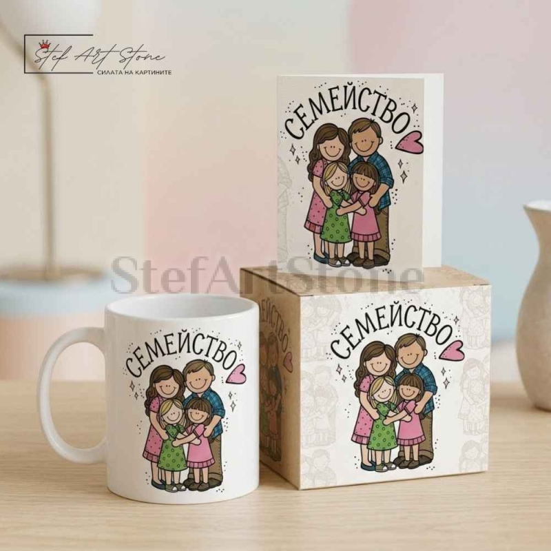 Сетът включва красива чаша с надпис "СЕМЕЙСТВО", тематична картонена кутия и нежна подаръчна картичка. Дизайнът се отличава с мила илюстрация на прегърнато семейство, символизираща обичта и сплотеността.