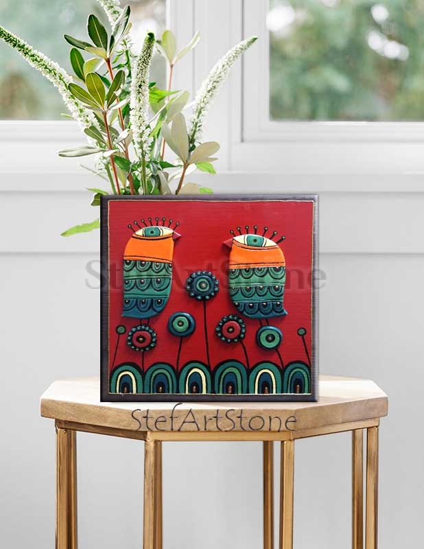 Акрилни бои. Птиците са ръчно изработени от глина.