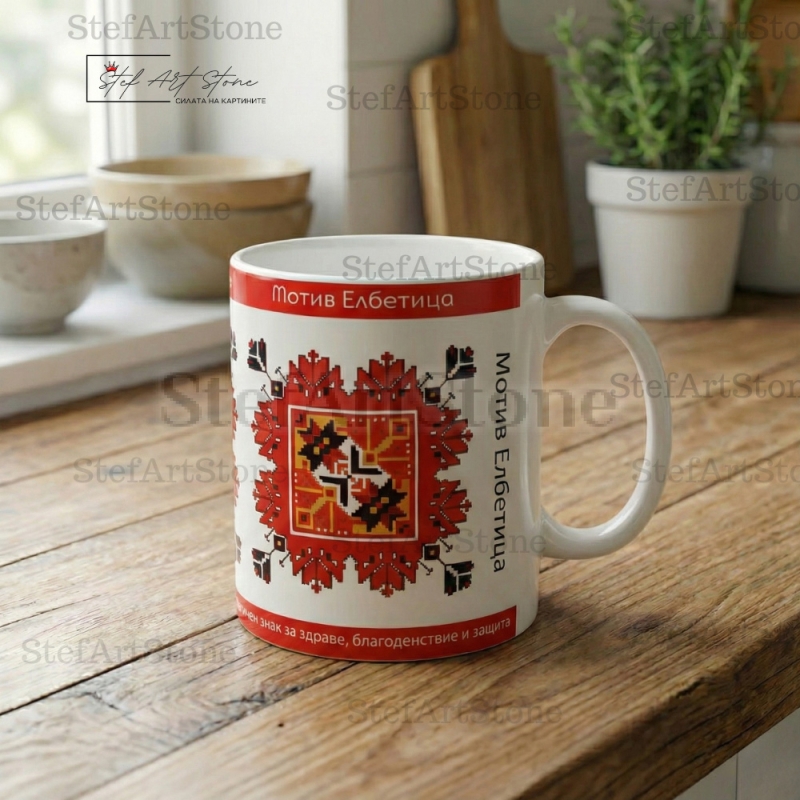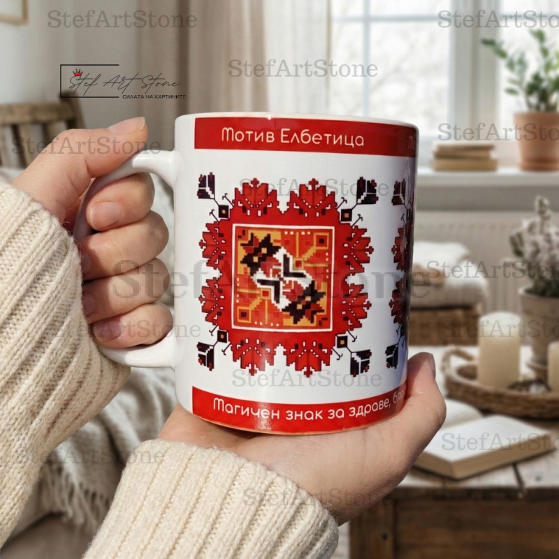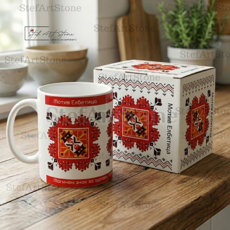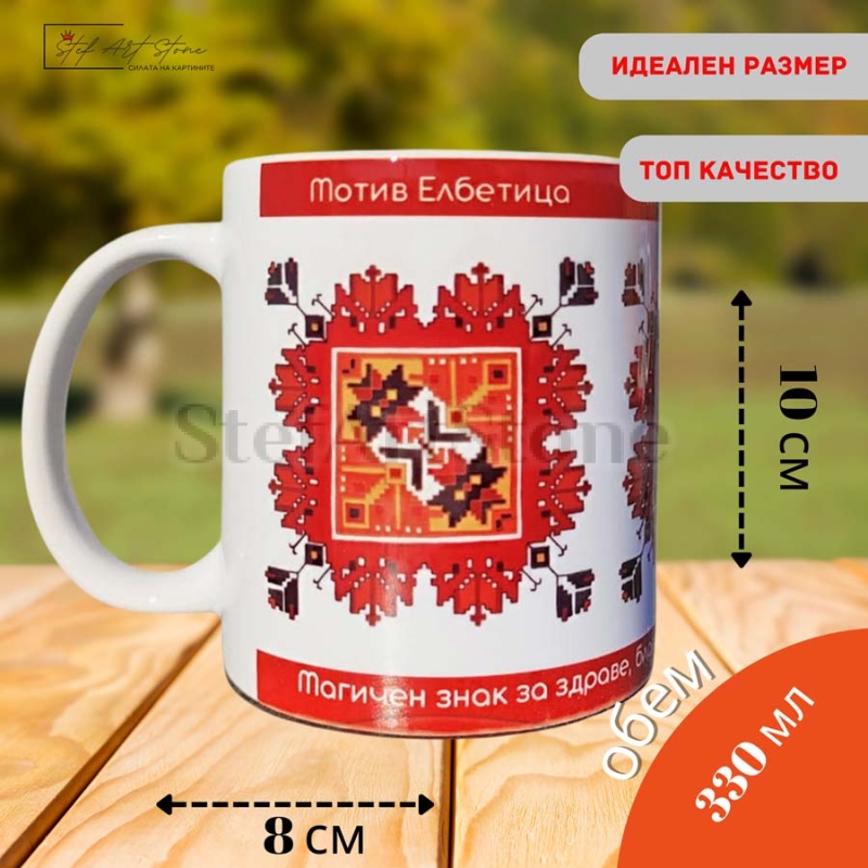 Модел No2 представя авторска репродукция на "Елбетица" в нейния най-плътен и геометричен вид. Но това, което прави чашата уникален подарък, са двата червени пояса с текст: