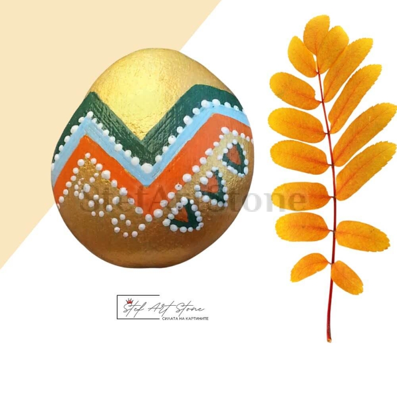 Съчетавайки златистия блясък с ярките и жизнерадостни цветове на природата, този ръчно рисуван камък носи послание за топлина, вдъхновение и радост. Това е подарък, който ще докосне сърцето на всеки, който го получи.