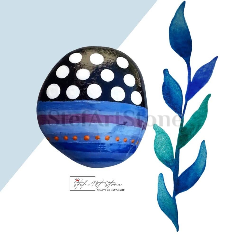 Внесете нотка на стил и оригиналност в своя дом с този ръчно рисуван камък. Съчетанието от лилаво, синьо и черно, подчертано с деликатни бели точки, създава изящна композиция, която привлича вниманието и носи спокойствие. Това произведение на изкуството е перфектен акцент за интериор и вдъхновяващ подарък за всеки повод.