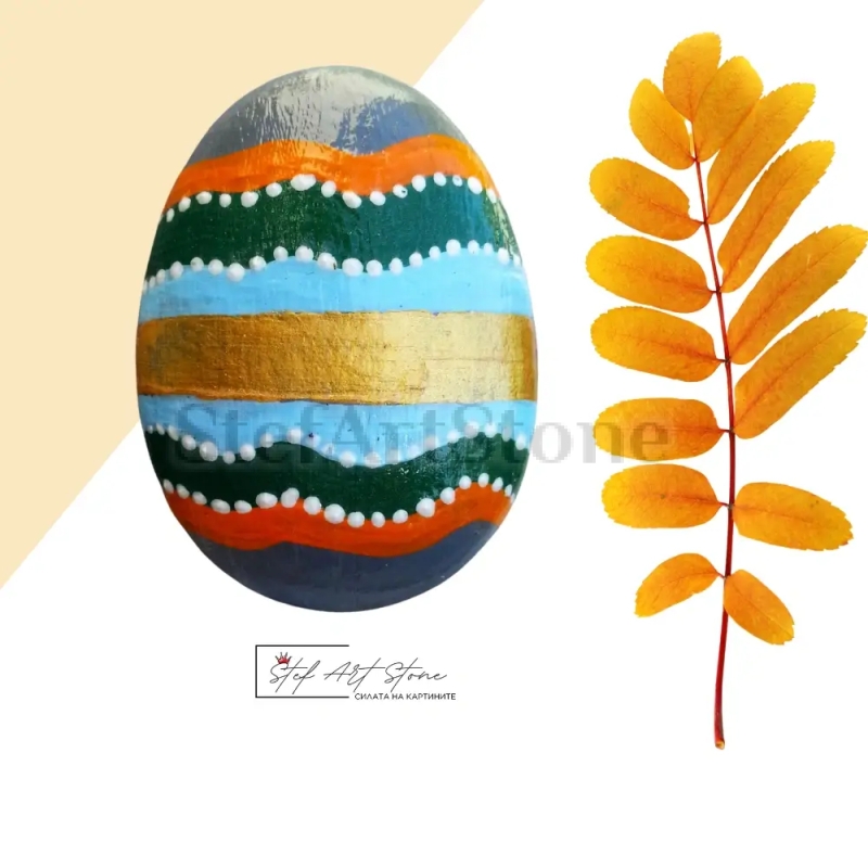 Ръчно рисуван камък в златно, светло синьо, зелено и оранжево – Изискана декорация с природно вдъхновение