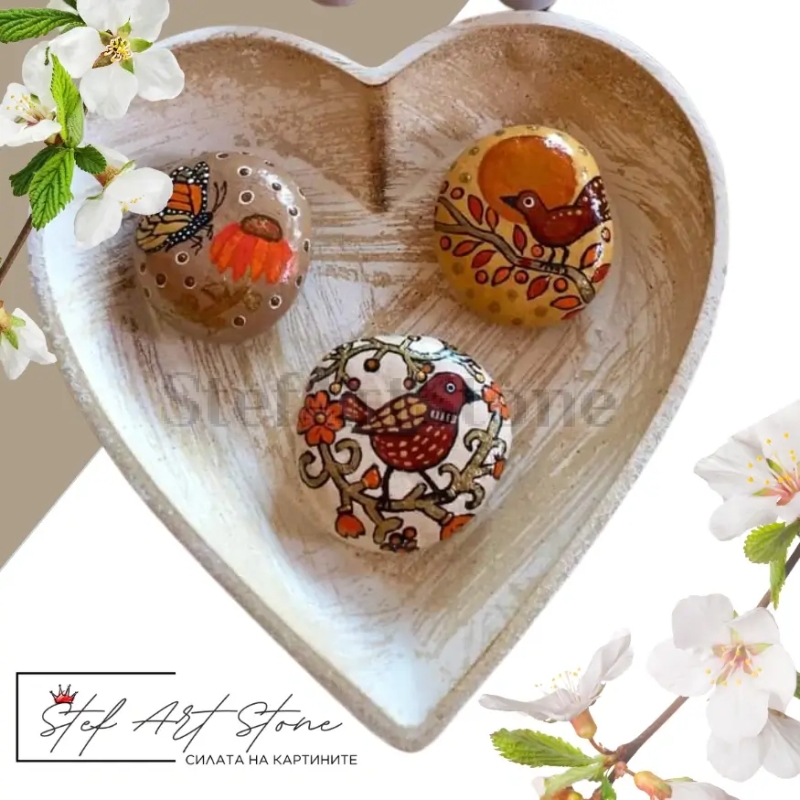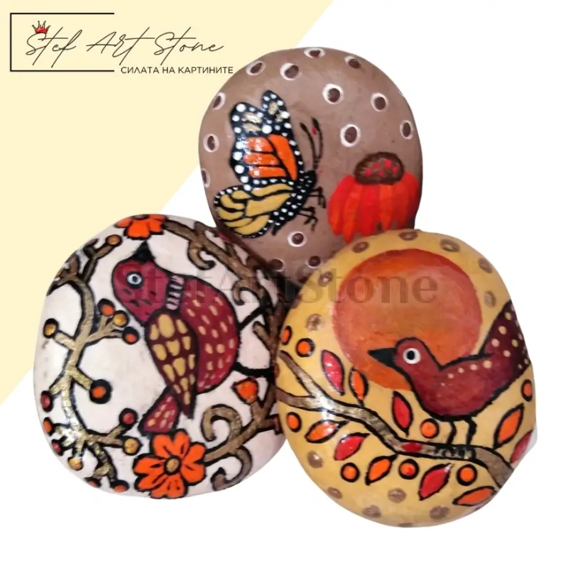 Ръчно рисувани камъни – комплект от 3 уникални дизайна с мотиви от природата.