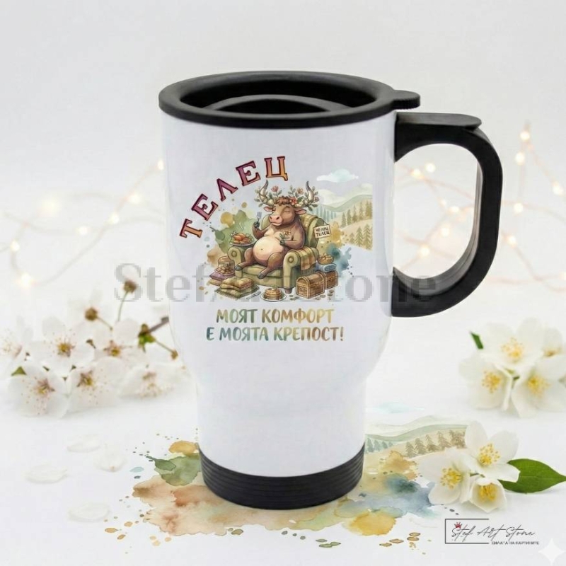 Голяма термо чаша за кафе (500 мл) с удобна дръжка и капак против разливане. Дизайнът е специално за зодия Телец с надпис: "МОЯТ КОМФОРТ Е МОЯТА КРЕПОСТ!". ✅ Пасва в поставката за чаши в колата.