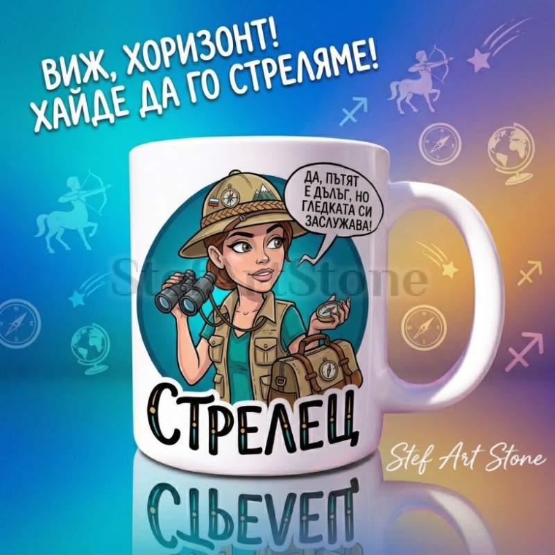 • Тип продукт: Висококачествена керамична чаша за сублимационен печат. • Вместимост: Стандартна 330 мл. • Материал: Бяла керамика отвътре, плътен цветен печат отвън. • Дизайн: Уникална комикс илюстрация с момиче изследовател в сафари екип и забавна реплика за зодия Стрелец. • Опаковка: Включена подаръчна кутия.